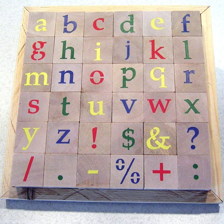 A set includes 36 blocks, each block is a 1½" wood cube. The front face of each block holds a capital letter or a number (A-Z, 0-9),